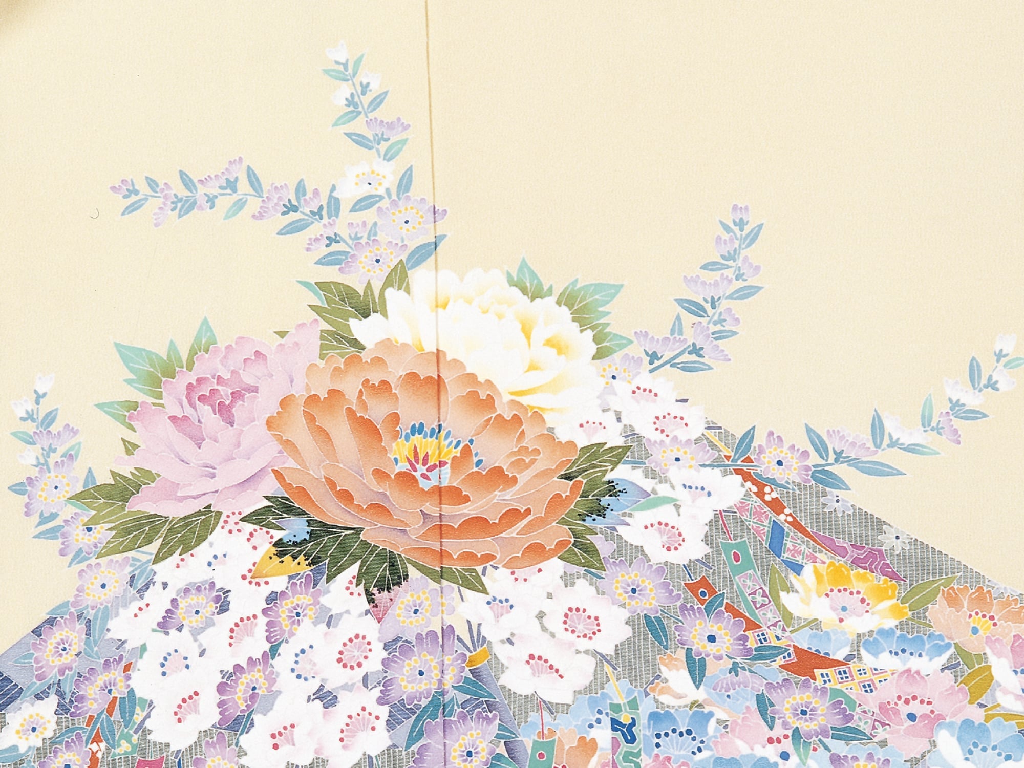 加賀友禅は、加賀百万石の武家文化のなかで培われてきました。加賀五彩と言われる臙脂・藍・黄土・草・古代紫を基調にして落ち着きのある写実的な草花模様を中心とした絵画調の柄が特徴です。線にも手描きの美しさが感じ取られ、仕上げに金箔や絞り、刺繍など染色以外の技法をほとんど用いないことも特徴の一つであり、加賀友禅には繊細な日本の心と、染めの心が絶えることなく脈々と息づいています。